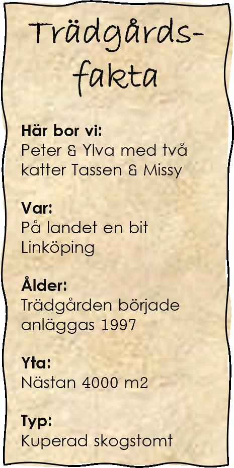 Om man färdas några mil söder om Linköping, förbi slättlandskapet, in i ett mer kuperat skogslandskap, om man sedan svänger in på en grusväg som slingrar sig några hundra meter in i skogen så kommer man fram till en liten glänta i skogen. På den platsen har vi skapat vår trädgård. För oss är den vår plats på jorden, en plats som hela tiden utvecklas och alltmer blir som vi vill ha den men som aldrig kommer att bli klar. För andra kanske det bara är en otillgänglig plats med en massa ogräs. Den fina är ju att det alltid är upp till betraktarens öga och vad man väljer att se och tycka om. Nåväl, det är en väldans massa ogräs och mycket är inte klart men trädgården bjuder också på en hel del fina områden med en hel del blommande växter.