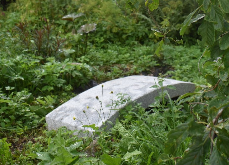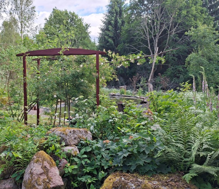 4/8-2025 En hemlig passage långt ner i trädgården, Parkträdgården via Asiendalen och Odlingsträdgården förbinds nu med en stenbro. Enkelheten i designen passar bra och smälter fint in i det gröna. Förvisso mest ogräs men i bakgrunden skymtar Kärrtörel Euphorbia palustris och Klippstånds Ligularia dentata som får vara lite pionjärer och bana mark för mer växter så småningom.