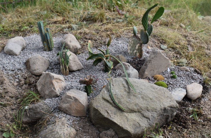 6/7-2025 Vår nya del, en kaktusplantering där våra stickiga vänner ska få lite sommarvila utomhus. Kaktusarna får stå kvar i sina krukor som grävs ner och dekoreras med grus och sten. I höst får vi såklart plocka in dom igen. En ful kulle av schaktmassor från husbygget blir till ett spännande inslag i trädgården som leder vidare till Medelhavsträdgården.