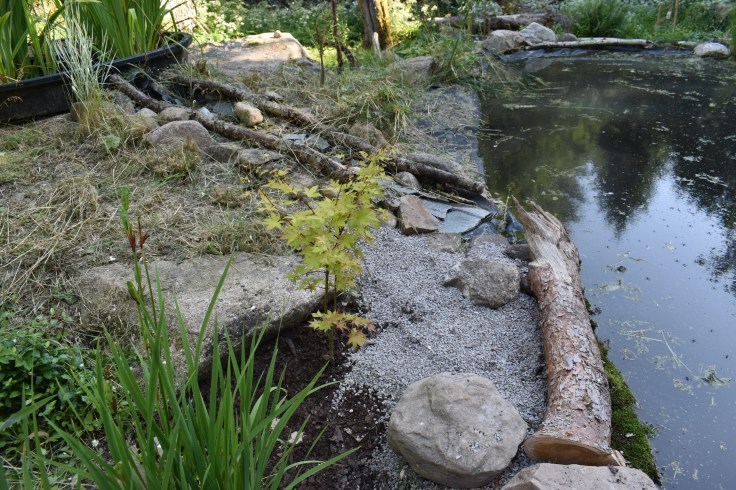 9/7-2025. En ny japansk lönn Acer palmatum ‘Summer Gold’ har fått sin plats i vår asiatiska del. Samtidigt som man får anledning att röja upp så är det kul att designa med sten, stock och grus. Mitt i det meterhöga ogräset hittade vi ytterligare en japansk lönn som vi glömt att vi hade. Lite puts och vattning så får vi hoppas att den inte gett upp