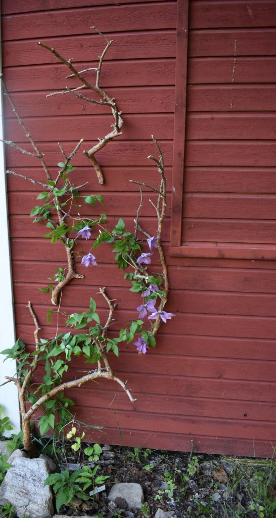 10/7-2025 Praktklematis Clematis patens ‘Ville de Lyon’. Inplanterad hösten 2024 0ch blommar hyfsat i år med tanke på att den varit lite överväxt och inte haft något att klättra på. Nu fick den ett fiffigt stöd av tallgrenar uppspikade på väggen. Försöker förtvivlat förstå hur de olika klematissorterna ska beskäras. Finns ju tre olika beskärnings-grupper men hur ska man komma ihåg vilken som hör till vilken.