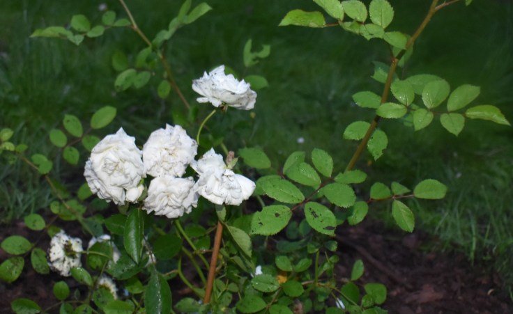 8/7-2025. Idag kom den äntligen ner, rosen Marie-Jeanne. En vinst från lotteriet under middagen på riksmötet i Skåne. Alltid svårt att bestämma plats men till slut landade jag i att byta ut en tanig Koco-Loko, den krukade jag upp och hoppas att den tar sig för att kunna få en ny plats senare. Nu får Marie-Jeanne pryda trädgården med sina små vita/rosa blommor som ska blomma långt in på hösten. En klasblommig Myskros som tydligen ibland hänförs till Polyanthagruppen.