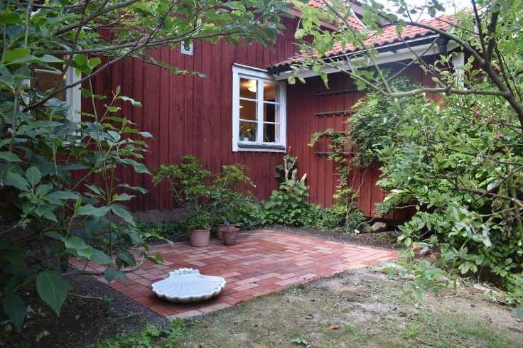 12/8-2025 Vår ”Italienska mini-piazza” blev klar idag med hjälp av våra trädgårdsdrängar och blev ett fint tillskott till vår Medelhavsträdgård. Nu fattas bara ett bord och stolar så blir det en fin sittplats, omgärdad av två magnolior och ett antal rosor, Maidens Blush, Skedarosen, Tuscany superb och en fylld kanelros. Tyvärr är allt överblommat för i år. Jag behöver komplettera så att det blir mer blomning över hela året. Krukor kan ju hjälpa upp det, just nu bara en Alströmeria med en ynka blomma tillsammans med två paraplyaralier. I hörnet växer ett Kentuckyblåregn, Wisteria macrostachya ’ Blue Moon’ och en Klematis, Clematis ’ Rough Cardinal’ som ska få ett fint klätterstöd så småningom.