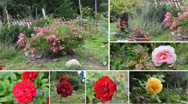 9/8-2025 Belöningen efter en hel dags hårt arbete i trädgården är att kunna sitta i vår rosengård och bara njuta av prakten och känna sig nöjd. Här är ett litet axplock ur vår rosengård: I nedre raden från vänster ses Carl Philip, Hot Chocolate, HC Andersen och Golden Celebration. Pink the Fairy, överst till vänster, har bjudit på hundratals blommor. I mitten till höger ses Astrid Lindgren, en pålitlig men väldigt taggig dam som blommar med fina fyllda rosa blommor. Överst till höger står vår vattensten som ett utropstecken och ger ett härligt rogivande porlande ljud, stenen omgärdas av stenkyndel Calamintha nepeta ‘Blue Cloud’ . Framför stenen syns återigen rosorna Hot Chocolate och Pink the Fairy. I krukan blommar en hängbegonia, Begonia tuberhybrida pendula ‘Illumination Orange’.