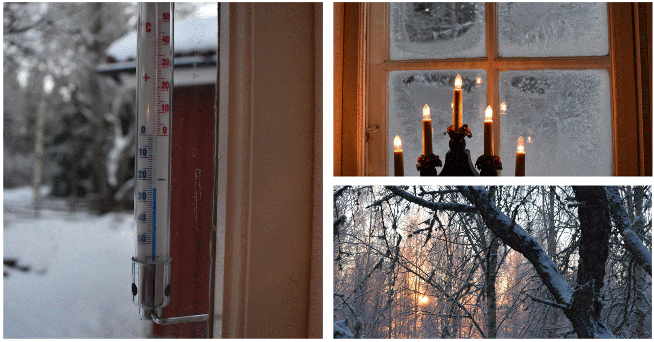 Temperaturen har nästan passerat 25 –grader, rimfrosten pryder fönstret och en blek januarisol stiger mödosamt upp på himlen. Nu när nyåret är passerat och solen idag tydligen tänker vara kvar hos oss 19 minuter längre än när det var som mörkast så finns det ett visst hopp om bättre tider och visst är det vackert när körsbärsträdets kala frusna grenar skapar kontrast mot mot den grå-blå-bleka himlen.