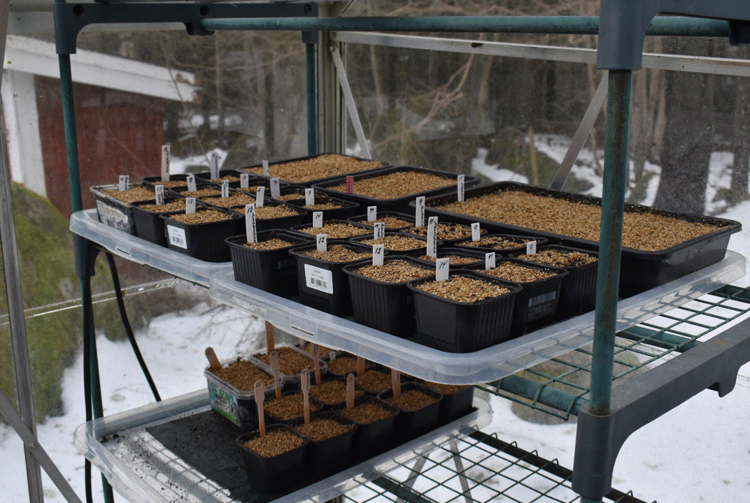 Nu är sådden på gång på allvar. Jag hittade ett antal gamla fröpåsar med perennfrön som jag köpt billigt via Trädgårdsamatörerna men som jag inte vet hur gamla dom är. Antingen så ska man kasta alltihop eller så stoppar man ner dom och ser vad det blir. Jag valde såklart det senare och nu står det en massa små krukor i växthuset. Jag har ju heller ingen aning om hur dom ska sås, det fanns ingen beskrivning på påsarna utan jag använde samma metod på samtliga. Sådde i plantjord med litet lager såjord överst, täckte fröna lite lagom med jord och så sist ett tunt lager med vermeculite. Sedan får de stratifieras (köldbehandlas) i växthuset för att sedan när vårsolen kommer så hoppas vi på grodd i massor.