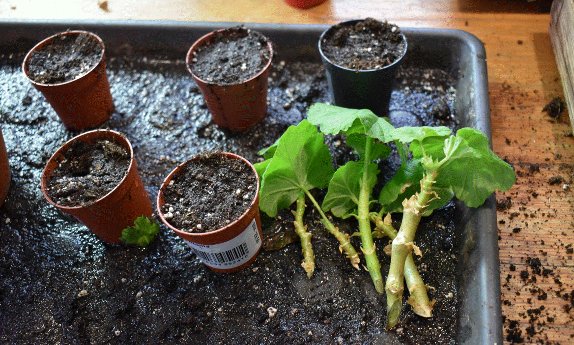 På bilden ovan syns sticklingar av en Mårbackapelargon, zonalpelargon.