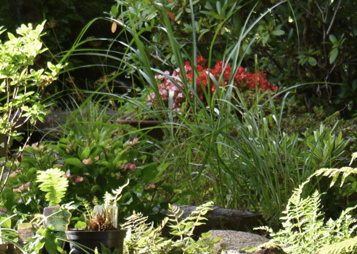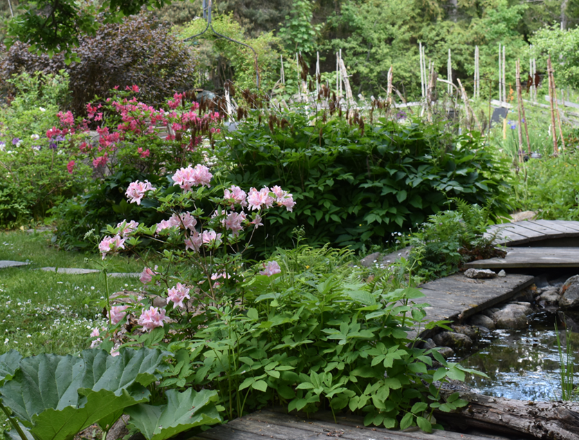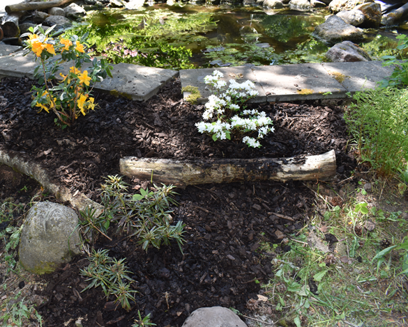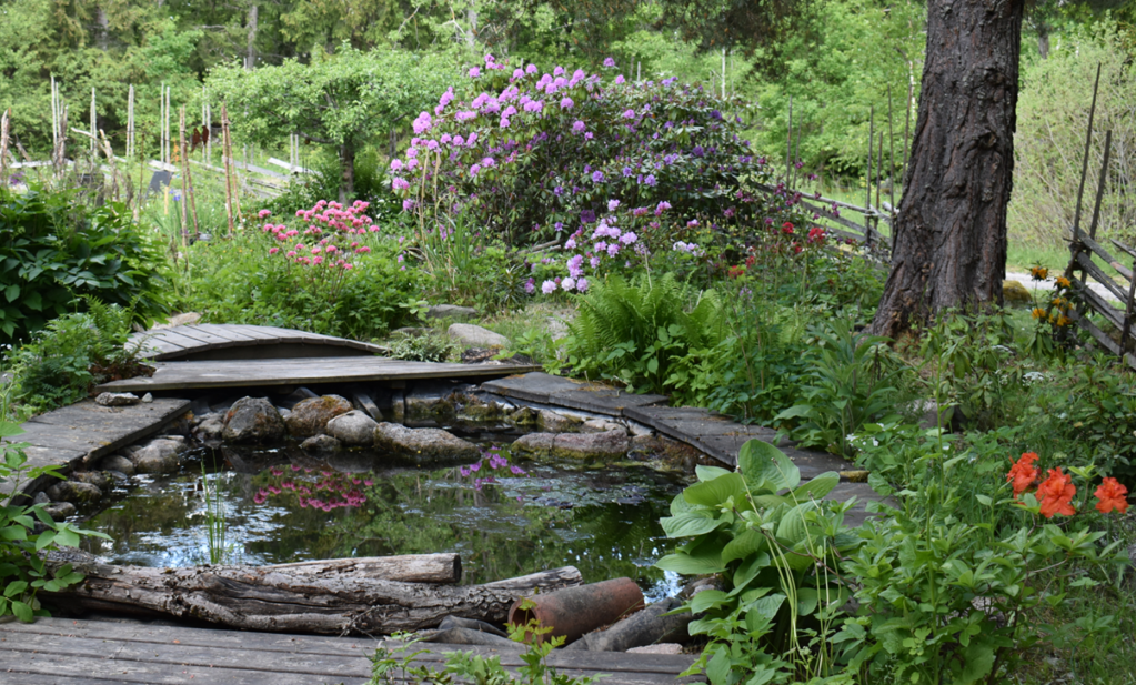 De flesta av våra Rhododendron är placerade i näheten av dammarna, mellan buskarna har vi börjat plantera in ormbunkar och hostor i olika former. För att få lite blommning även under sensommar höst så försöker vi med olika sorters hortensior.