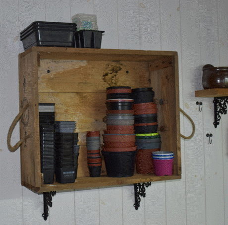 Ordning och reda. En ny hylla i Orangeriet med plats för krukor och så-kärl