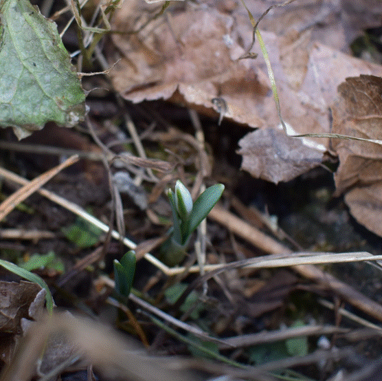 Första snödroppen börjar titta upp, fick leta lite, men visst fanns den där, gömd under löven.