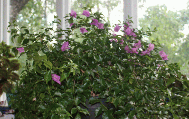 Bougainvillean, har sitt ursprung i Brasilien, har fått bo i Orangeriet under vintern. Genom att klippa ner den ganska kraftigt i februari-mars så stimuleras nytillväxten. Blomningen sker på årsskotten. Bougainvillean kallas även trillingblomma, vilket kommer sig av att de ”blommor” som man ser inte är de egentliga blommorna utan är tre tunna högblad som omsluter de egentliga pyttesmå blommorna.