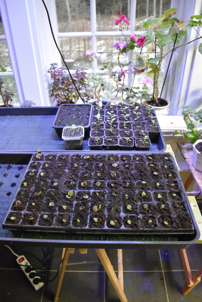Idag har jag fyllt ett pluggbrätte med begonior och så blev det lite sådd av Glansmiskantus och de första tomaterna, en sort som vi alltid sår, en körsbärstomat som är pålitlig ‘Gardeners delight’
