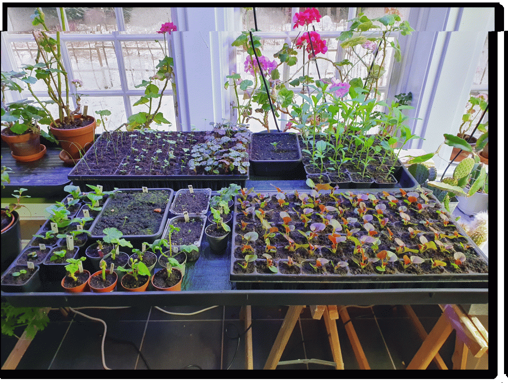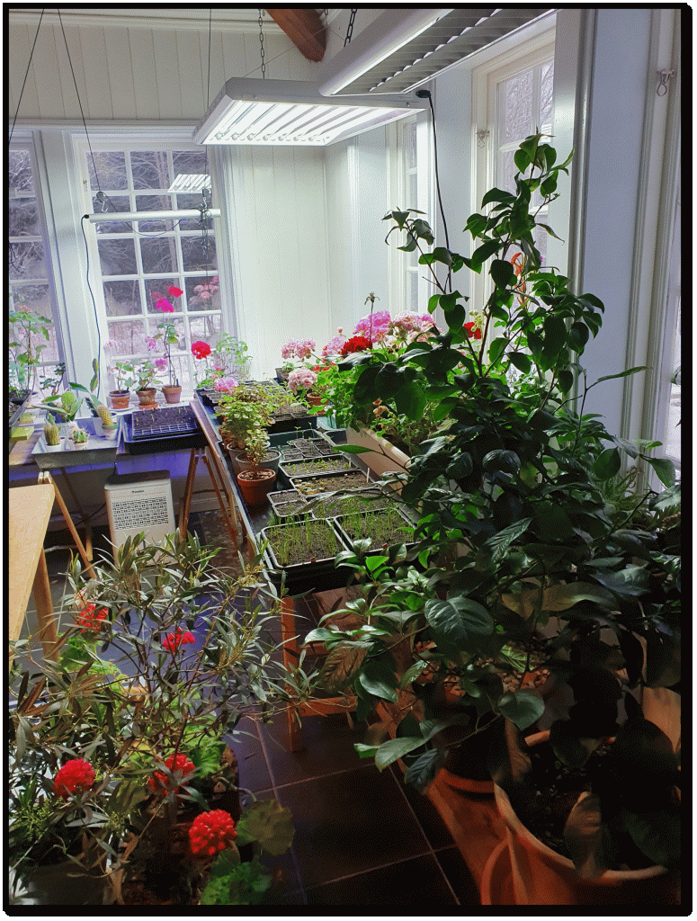 Full vinter ute, -12 grader på mornarna. Inte att tänka på att öppna upp i växthuset idag som det var tänkt. Orangeriet är sprängfyllt med sådder