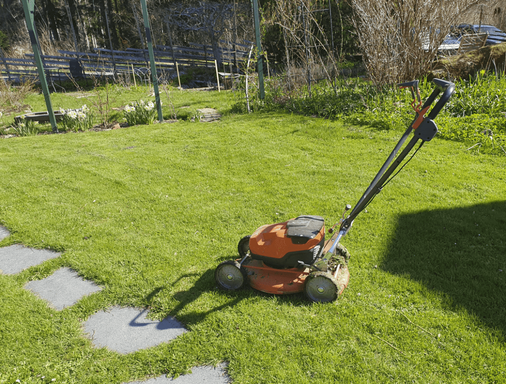 1:a gräsklippningen för året, en klippt och välskött gräsmatta kan lyfta intrycket av trädgården många nivåer. Jag är dock inte hejdundrande entusiastiskt över gräsmatta, det som genererar mest jobb i trädgården är just gräsmattan så min rekommendation är att ta bort så mycket som möjligt av gräsmattan och ha bara kvar den på en liten yta