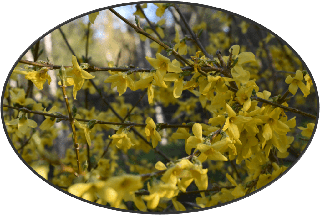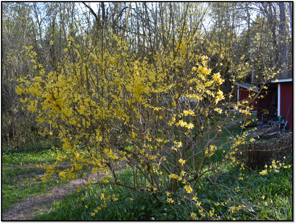 Forsythian är en trogen återkommare i trädgården. Skulle dock må bra av lite hårdare beskärning. Vårt exemplar är hämtat från den trädgård i Flen där jag växte upp, därför är det extra roligt när den blommar.