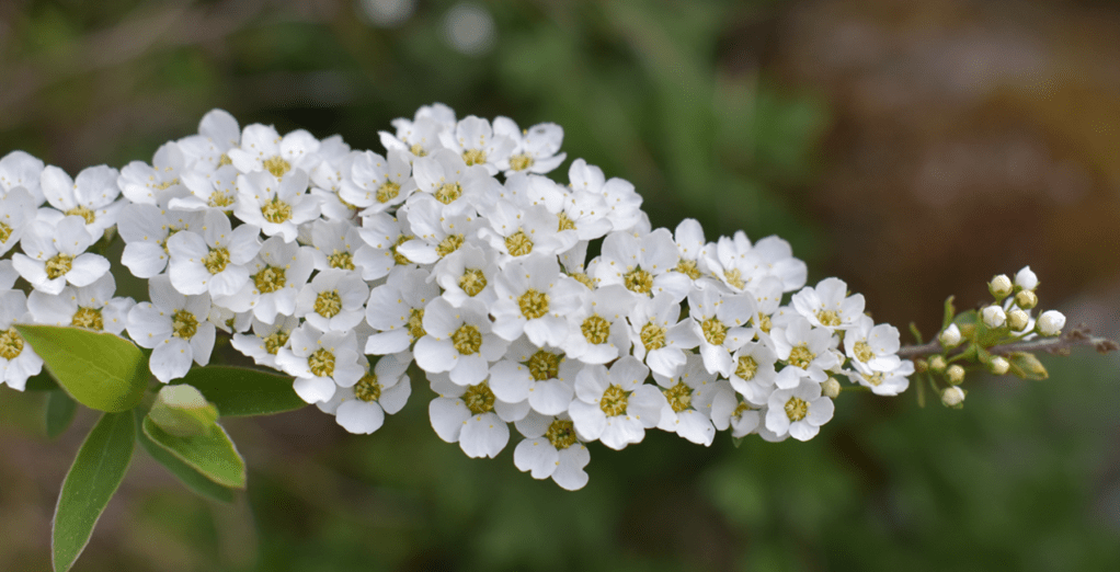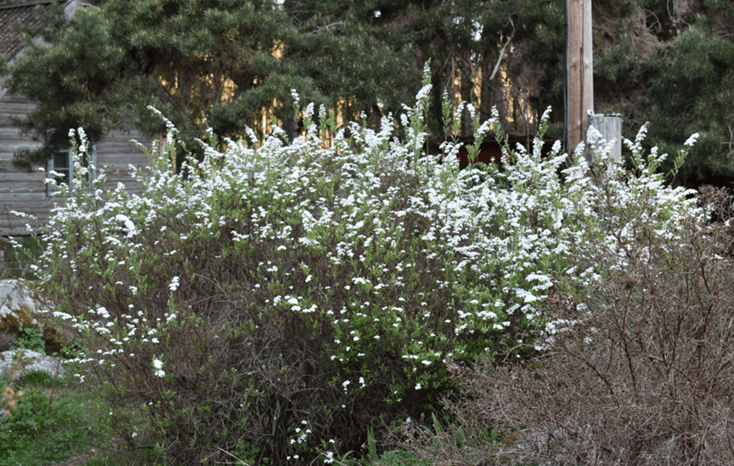 Norsk brudspirea blommar med ett fantastiskt vitt flor i apr/maj.