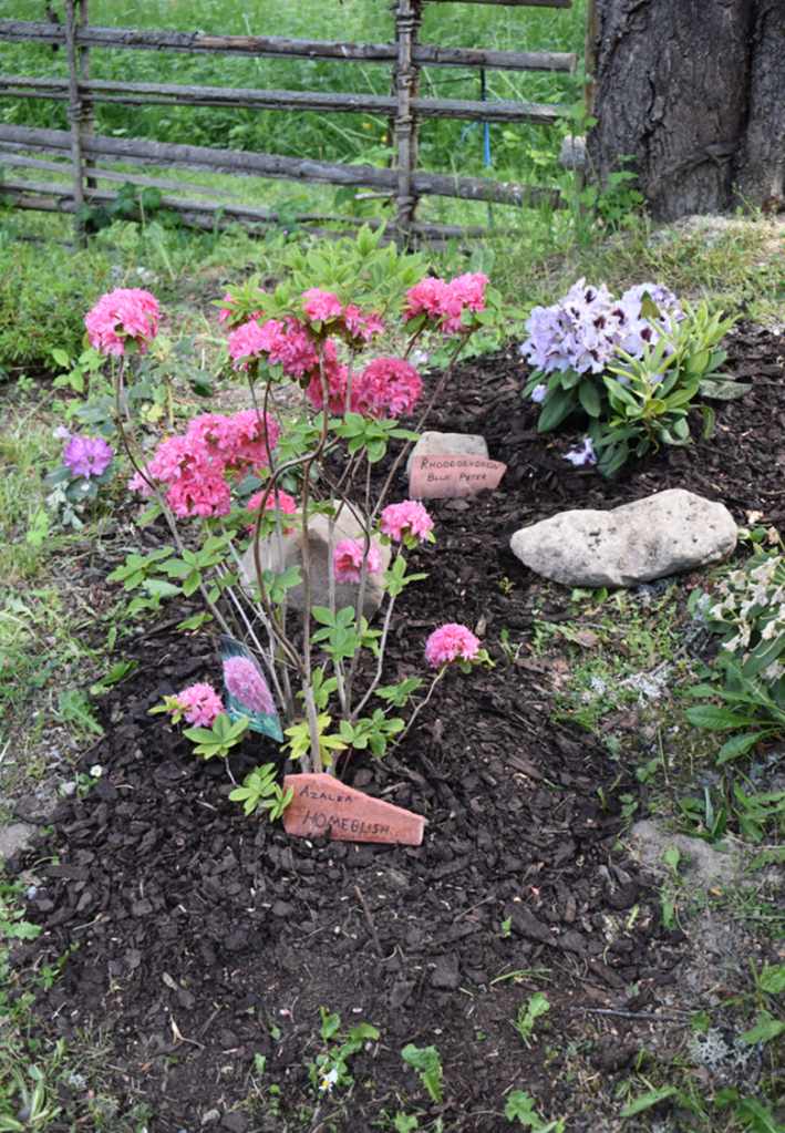 Rhododendron (Knap Hill) Trädgårdsazalea ‘HomeBush’), en azalea med buskigt växtsätt och blommar i maj-juni med Rosa-mörkrosa blommor i bollformad klase. Bakom den sitter Rhododendron ‘Blue Peter’, en Rhododendron med lila stora blommor som når en höjd av 1,5m.