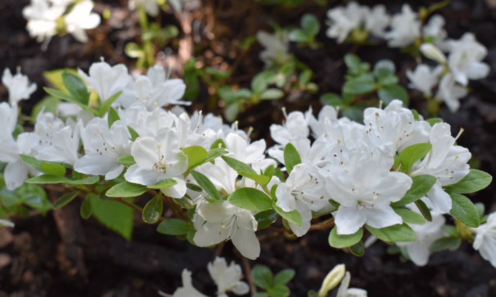 Här ses en ytterligare en azalea, Rhododendron (Knap Hill) Trädgårdsazalea ‘Klondyke’) med väldoftande guldorange blommor med bärnstensgula knoppar. Den vita skönheten är en okänd sort men troligen en japansk azalea med makalösa blommor.
